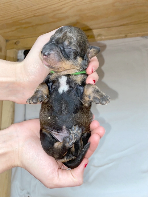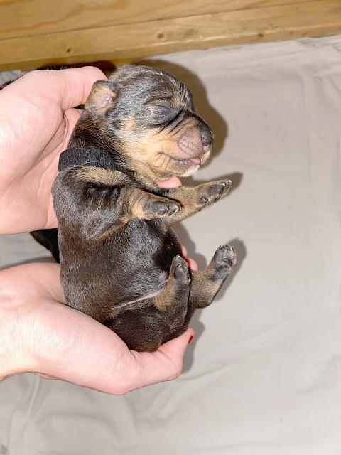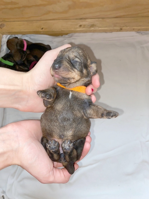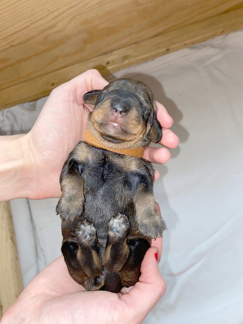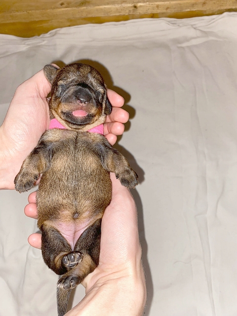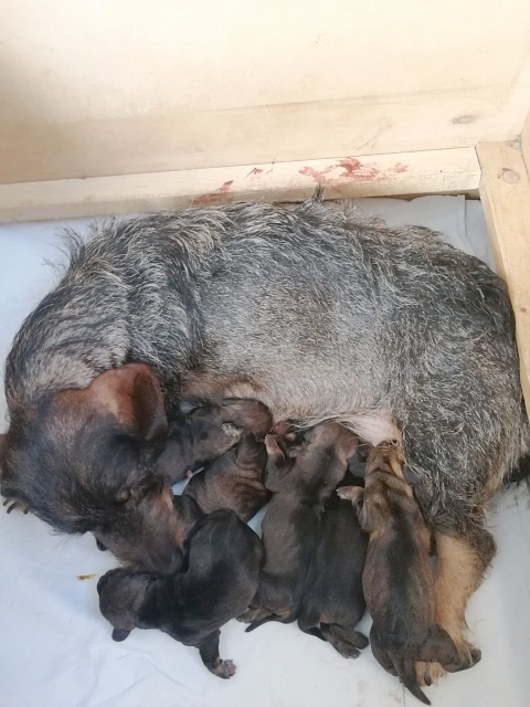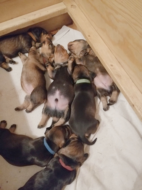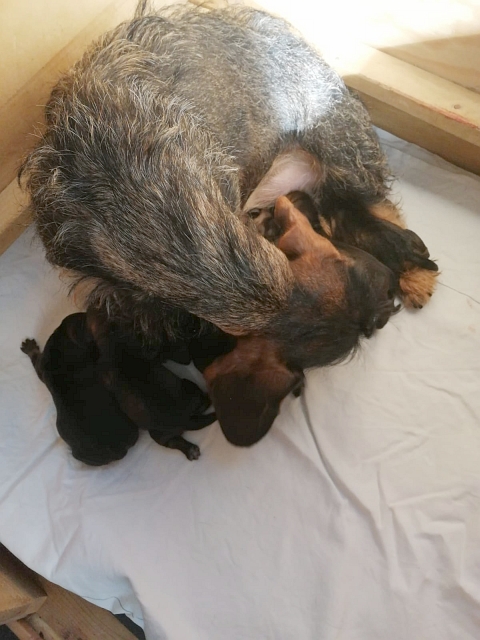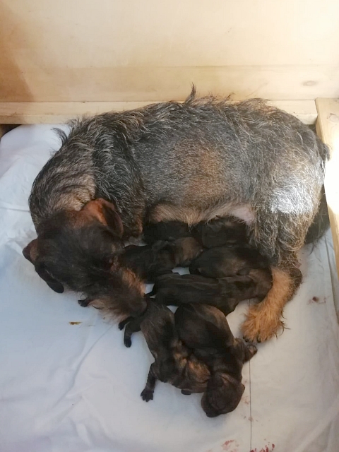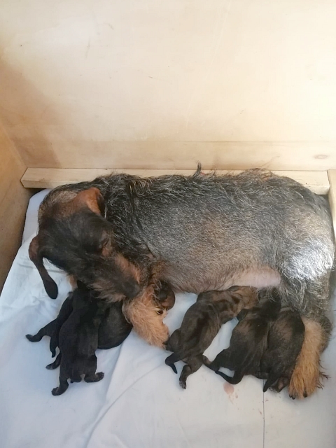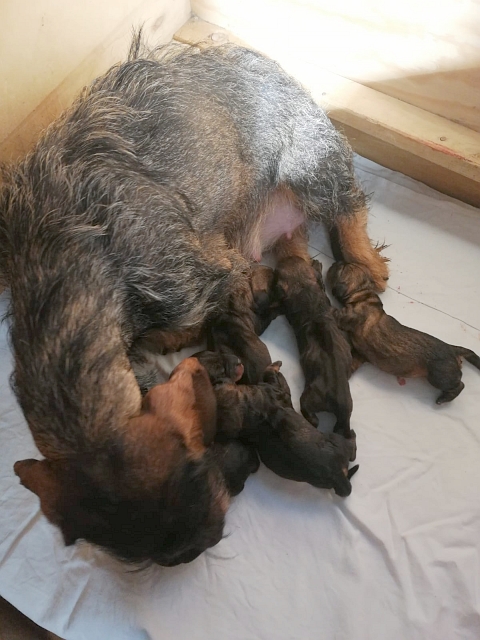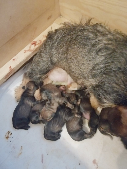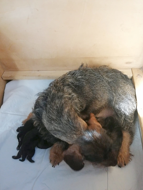 unse­re Hün­din Hum­mel hat am Kar­ne­vals­diens­tag, dem 13. Febru­ar 2024, sie­ben gesun­de, dun­kel-saufar­be­ne Wel­pen gewölft, drei Rüden und vier Hün­din­nen! Die Mama und ihre klei­nen Wel­pen sind gesund und mun­ter. Die Geburts­ge­wich­te der Klei­nen lagen zwi­schen 189 und 310 Gramm.