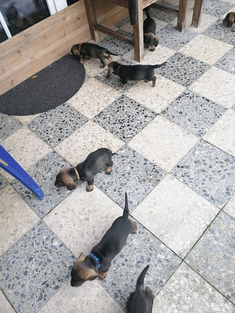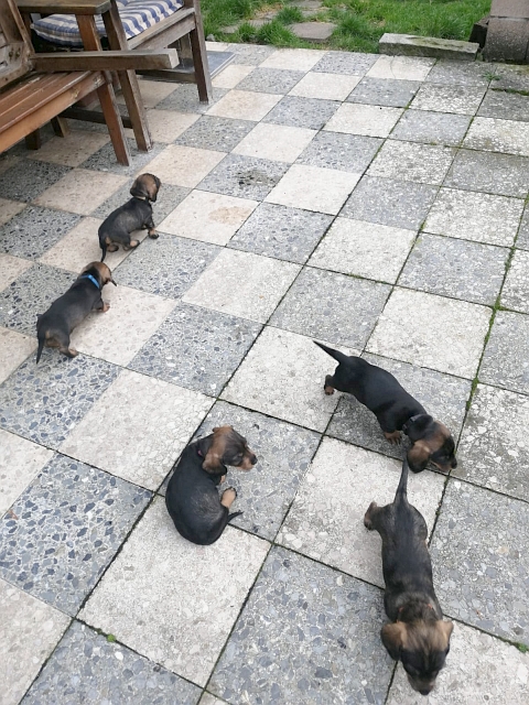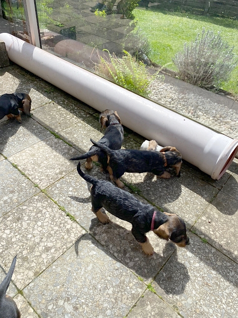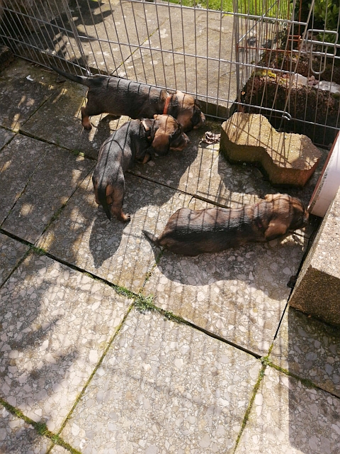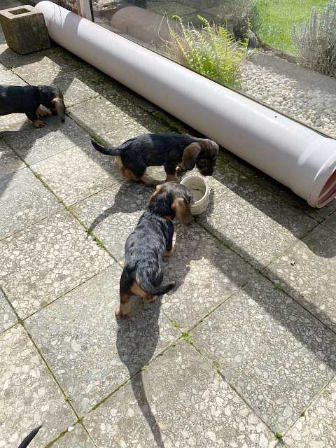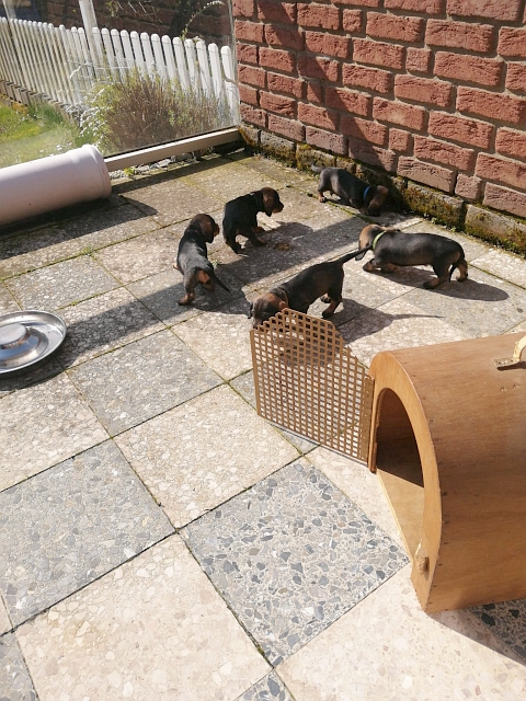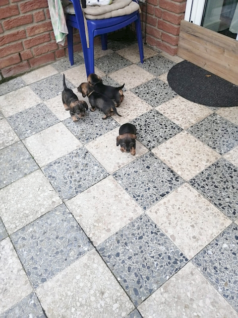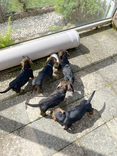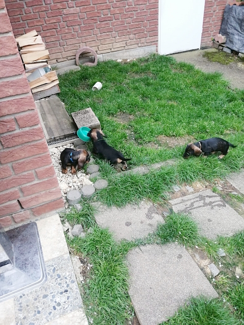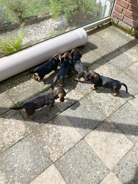 19.03.2024: Die Wel­pen sind heu­te 5 Wochen alt und genie­ßen die son­ni­gen Tages­stun­den schon sehr ger­ne drau­ßen. Alle sind mun­ter und dackel­ty­pisch recht neu­gie­rig.