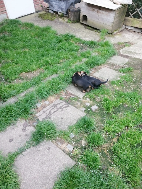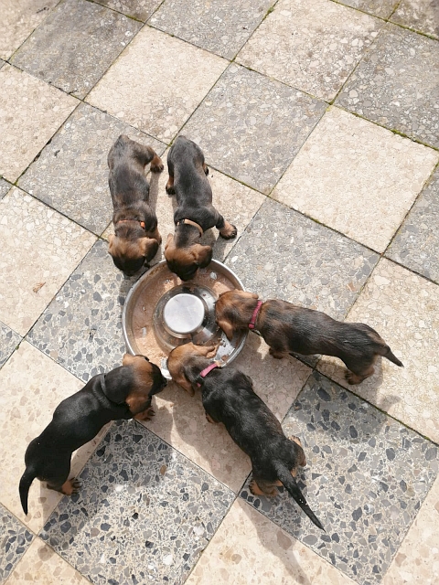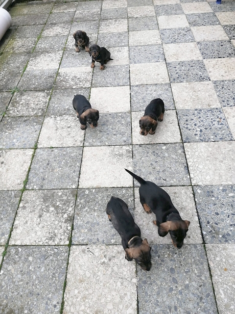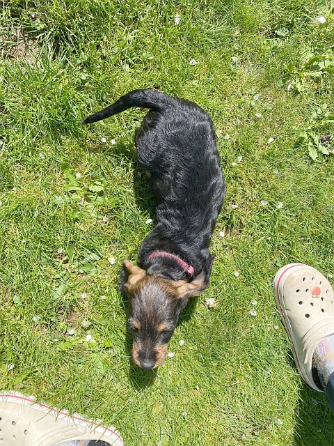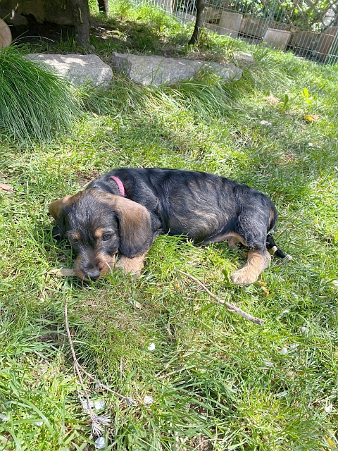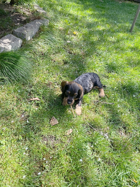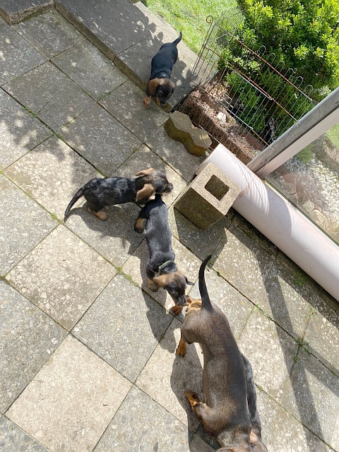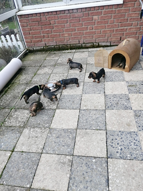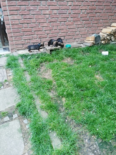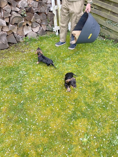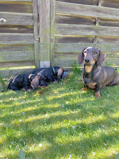 19.03.2024: Die Wel­pen sind heu­te 5 Wochen alt und genie­ßen die son­ni­gen Tages­stun­den schon sehr ger­ne drau­ßen. Alle sind mun­ter und dackel­ty­pisch recht neu­gie­rig.