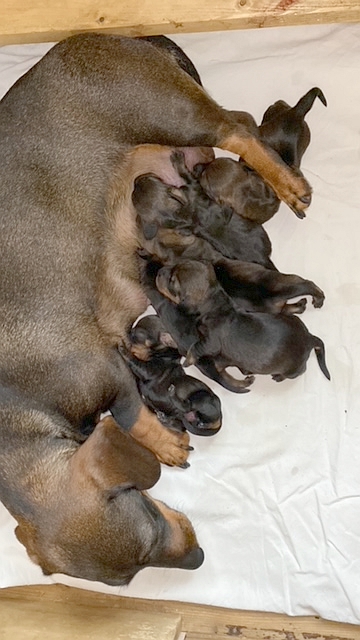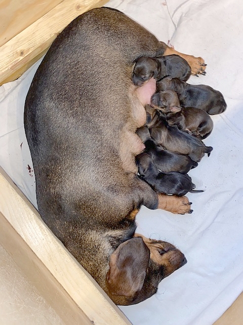 unsere Hündin Fine hat am Freitag, dem 17. März 2023, sechs gesunde Welpen gewölft, zwei Rüden und vier Hündinnen! Die Mama und ihre kleinen Welpen sind gesund und munter.