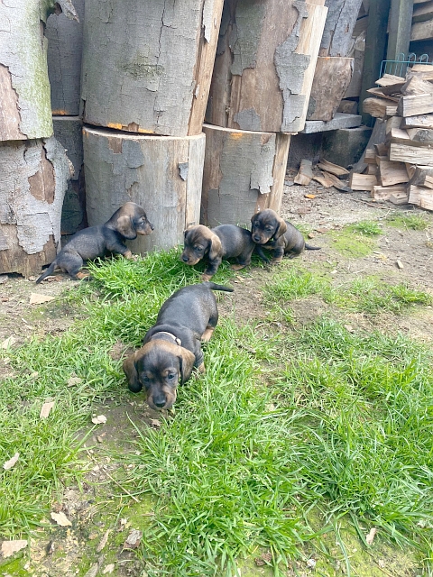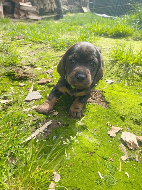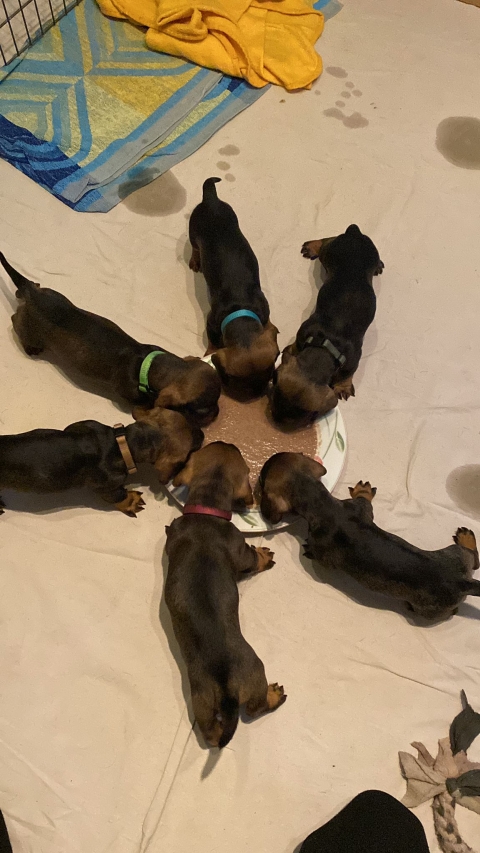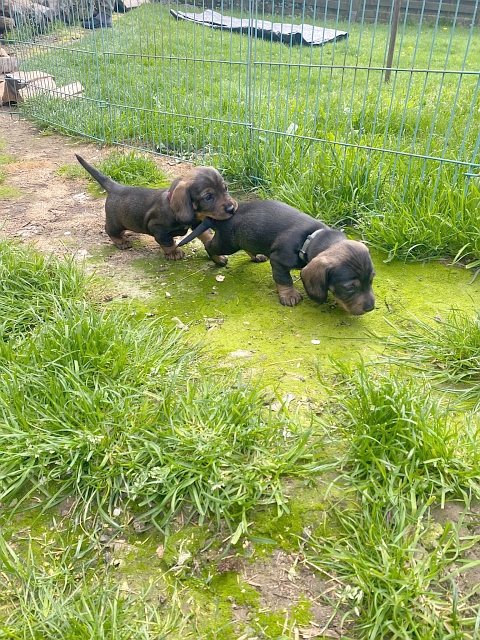 20.04.2023: Die Welpen haben sich prächtig entwickelt und nun das erste Mal ihren Brei bekommen. So gestärkt durften sie auch zum ersten Mal in den Garten und erkundeten die neue Umgebung.