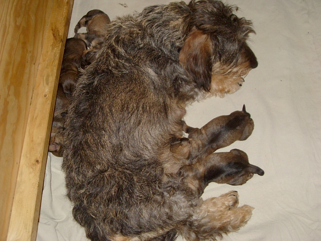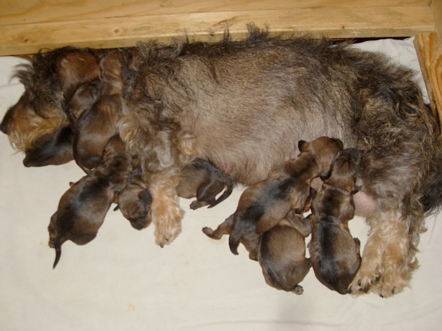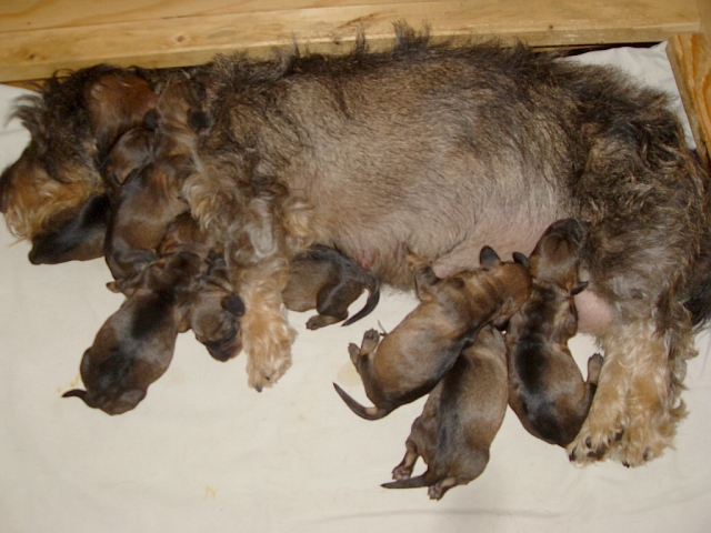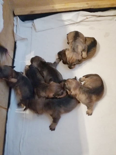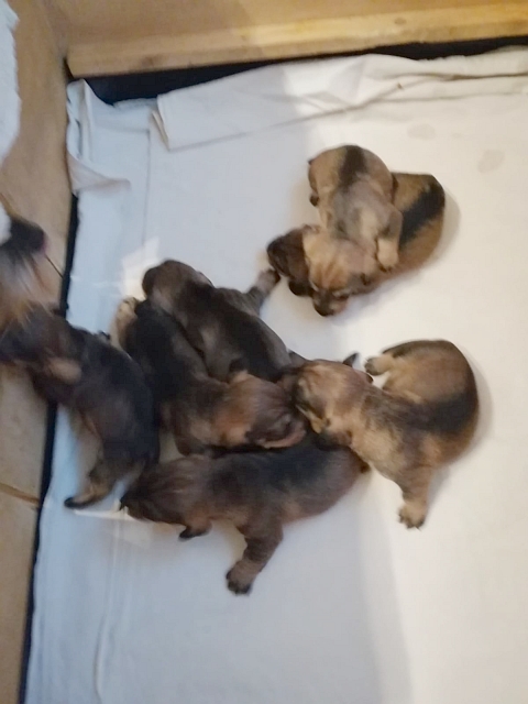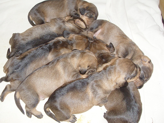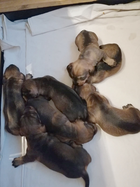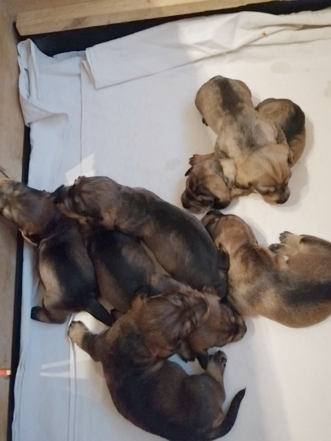 unsere Hündin Dakota hat am Freitag, 27.05.2022, sieben gesunde Welpen gewölft, vier Rüden und drei Hündinnen. Die Geburtsgewichte der Kleinen lag zwischen 252 und 315 Gramm. Alle sind dunkelsaufarben und wohlauf.
