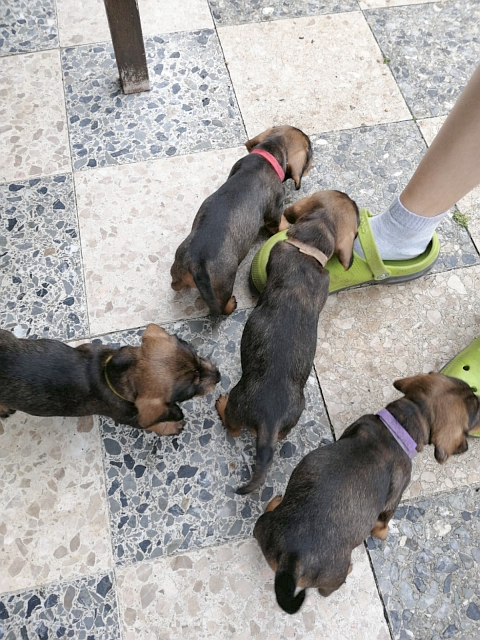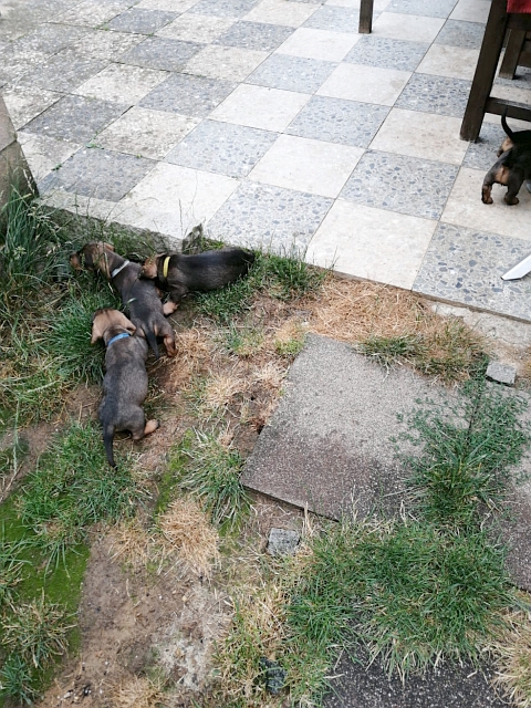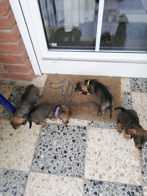 26.06.2022: Heute sind die Puppies 4 Wochen alt und das erste Mal draußen! Wie man sieht, gefällt ihnen das ausgezeichnet 😉