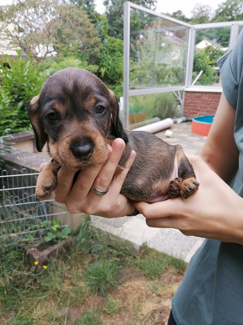 * 31.10.2020 - rauhaar-dkl-saufarben - Gewicht ca. 8,5 Kg - Lebhafte, ausdrucksvolle, zierliche Hündin mit freundlichem, charaktervollem Wesen Formwert: SG Leistungszeichen: BHP1, Sp/J, Sfk Untersuchungen: 1. OI- frei- getestet, 2. Pra/Katarakt-frei-getestet, 3. Crd/pra – getestet- reinerbig |