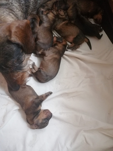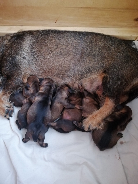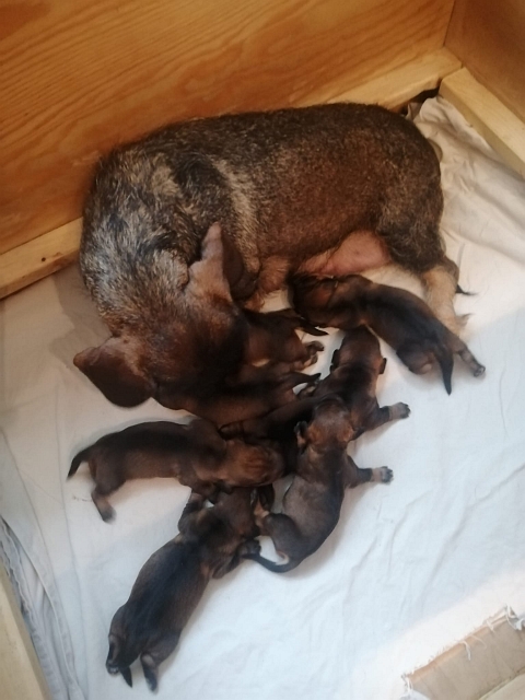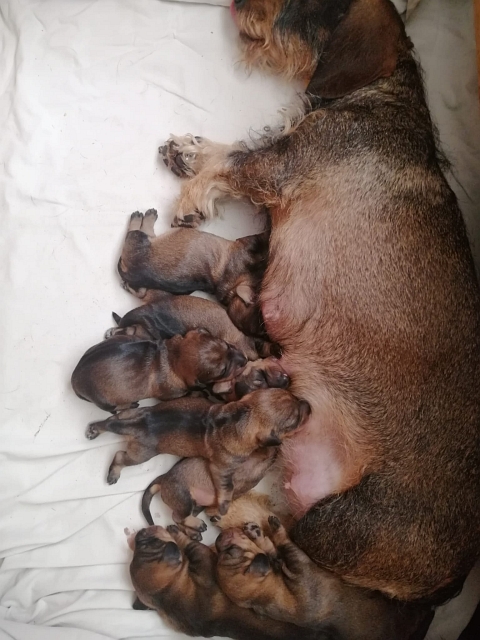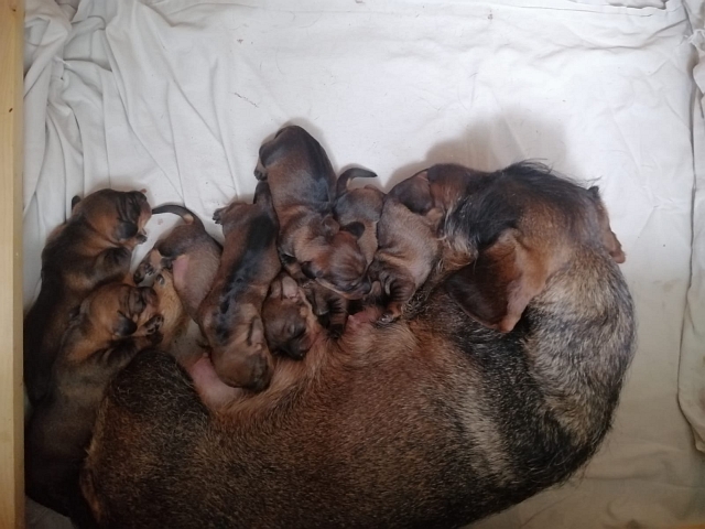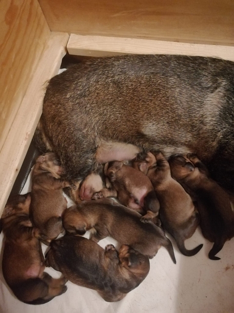 unsere Hündin Hummel hat am 2. Juni 2025 ohne Komplikationen sieben gesunde, dunkel-saufarbene Welpen gewölft, ein Rüde und sechs Hündinnen. Hummel und ihre Puppies sind wohlauf. Die Kleinen trinken fleißig. Vom Gewicht her war von 220 Gramm bis 310 Gramm alles vertreten.